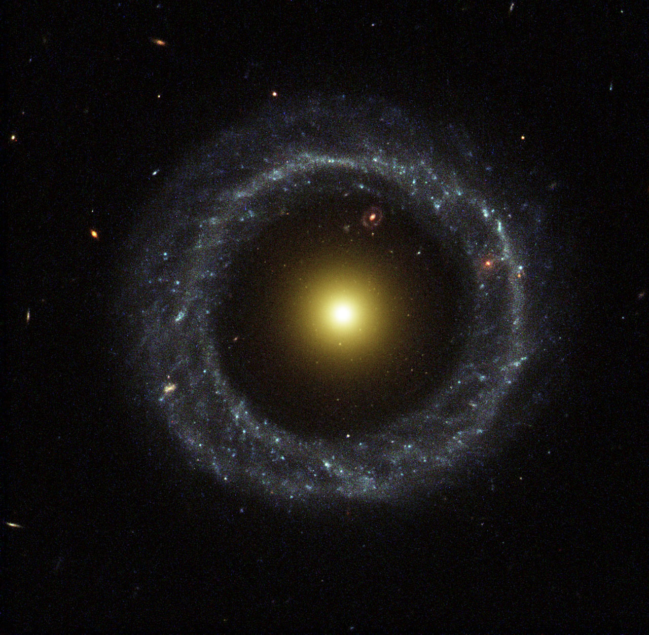 Some galaxies have a ring-like structure of stars and interstellar medium surrounding a bare core.